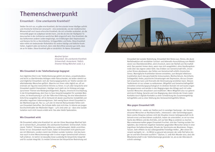 Mit einem Motiv für Tragetaschen und kleinen Infokarten sind wir 2010 gestartet. Seither unterstützen wir die Telefonseelsorge bei ihren Jahresberichten oder anderen Kommunikationsmaßnahmen. Natürlich sind wir auch Fördermitglied.
